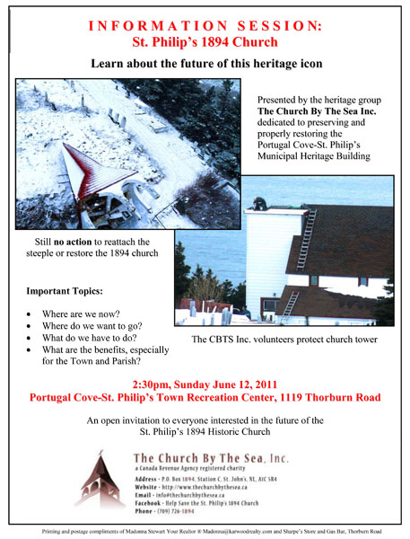 We are extending an open invitation, especially to all residents of the town of Portugal Cove-St. Philip's, the St. Philip's Anglican Parish, and anyone interested in saving the 1894 church, to come to an Information Session from 2:30 - 3:30pm on Sunday, March 28th at the Town Recreation Center, 119 Thorburn Road.